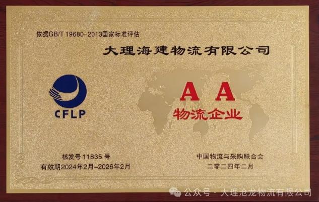 大理海建物流榮膺國家AA級物流企業(yè)