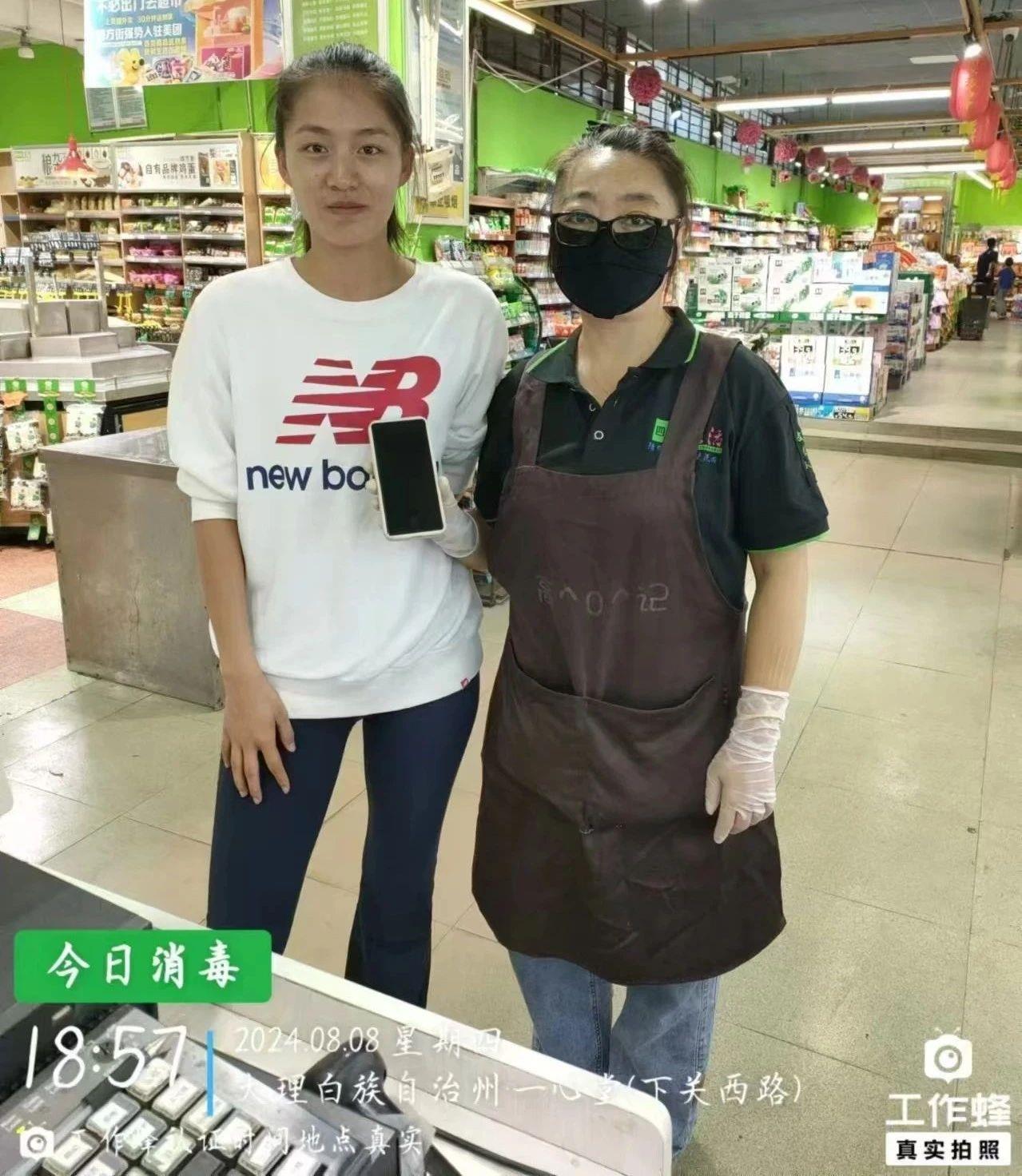 8 月 29 日晚 10 點 17 分,雙廊店的楊春笑在收銀臺撿到了一部手機。彼時,旁邊有幾位游客,楊春笑趕忙詢問是誰的手機,他們皆表示不是。于是,楊春笑先將手機妥善收好。