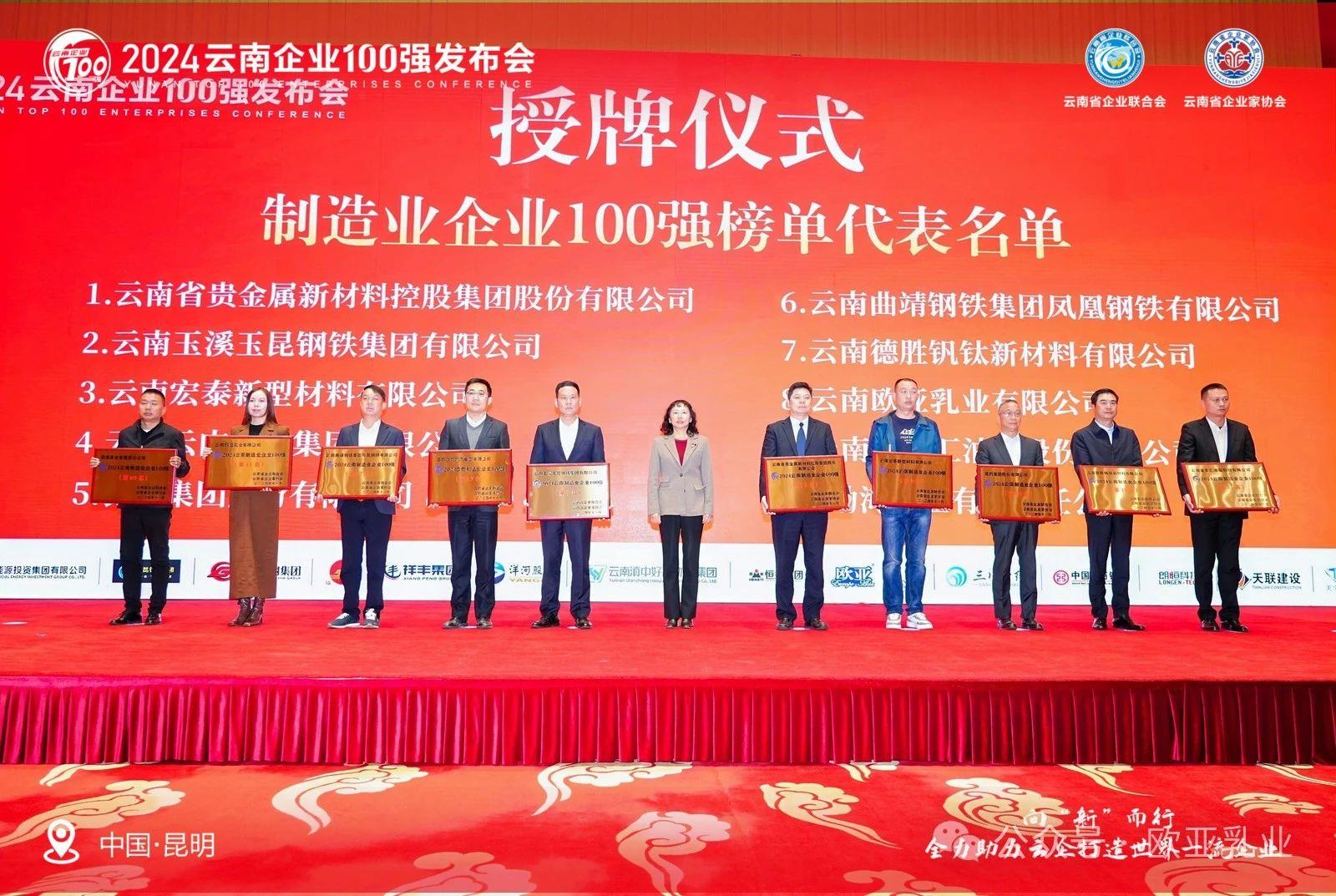 11月22日下午,由云南省企業(yè)聯(lián)合會、云南省企業(yè)家協(xié)會主辦的“2024云南企業(yè)100強發(fā)布會”在昆明海埂會堂隆重舉行,大理州企業(yè)家協(xié)會理事單位——云南歐亞乳業(yè)有限公司被授予“云南企業(yè)100強”“云南制造業(yè)企業(yè)100強”雙百強榮譽,公司常務(wù)副總馬紫怡出席會議并代表公司領(lǐng)取獎項。